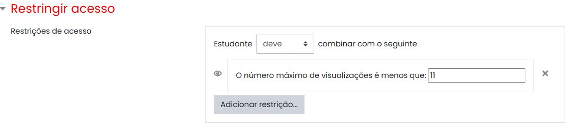 Por padrão, o Moodle possui restrições de acesso a conteúdos por Data, Nota e Perfil. Mas para solucionar a situação fui atrás de outros plugins. Achei o Max Views, que permite configurar quantas vezes o usuário pode clicar em um determinado recurso até ficar inacessível.